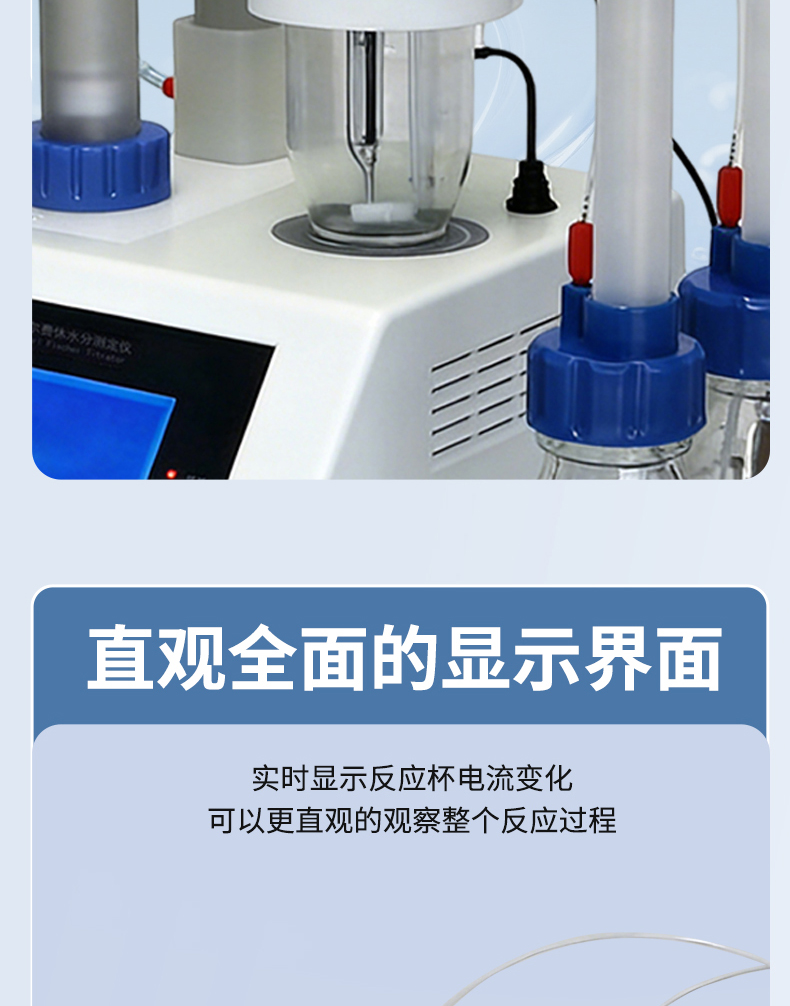 Ø 4、实时显示反应杯电流变化,可以更直观的观察整个反应过程,更准确的测量样品,滴定过程中实时显示卡尔费休试剂消耗量,水质量,以及水分含量。