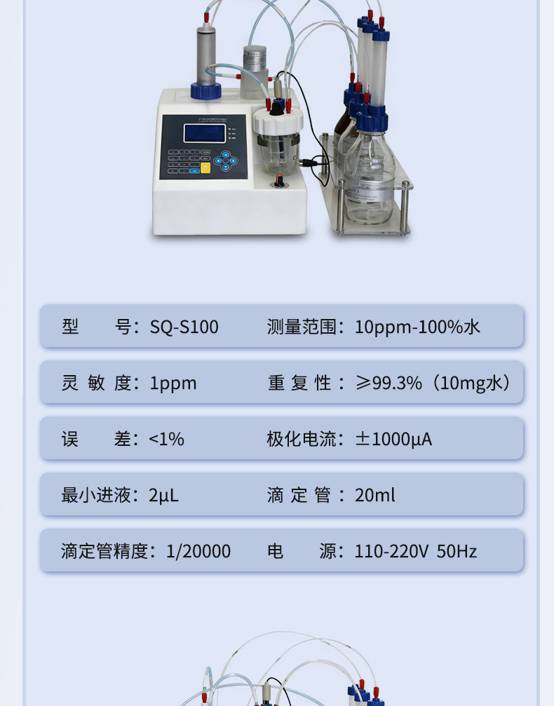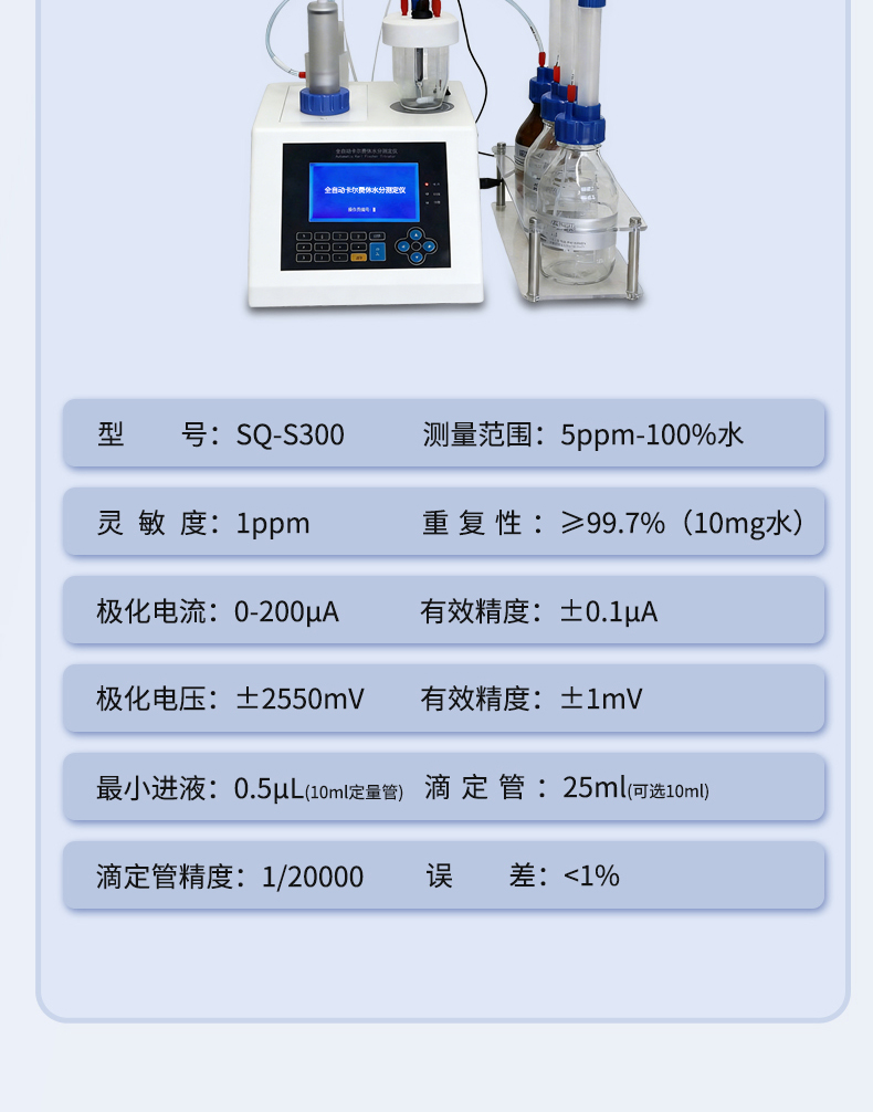 SQ-S300卡尔费休水分测定仪符合中国用户的使用习惯, 具有测量精度高,重复性好,质量稳定等特点。可广泛应用于化工,制药,食品,电池,塑料等行业的应用,也适用于高校,质检,科研机构等各种各样水分含量的应用,可快速而精确的测量10ppm到100%的水分含量。