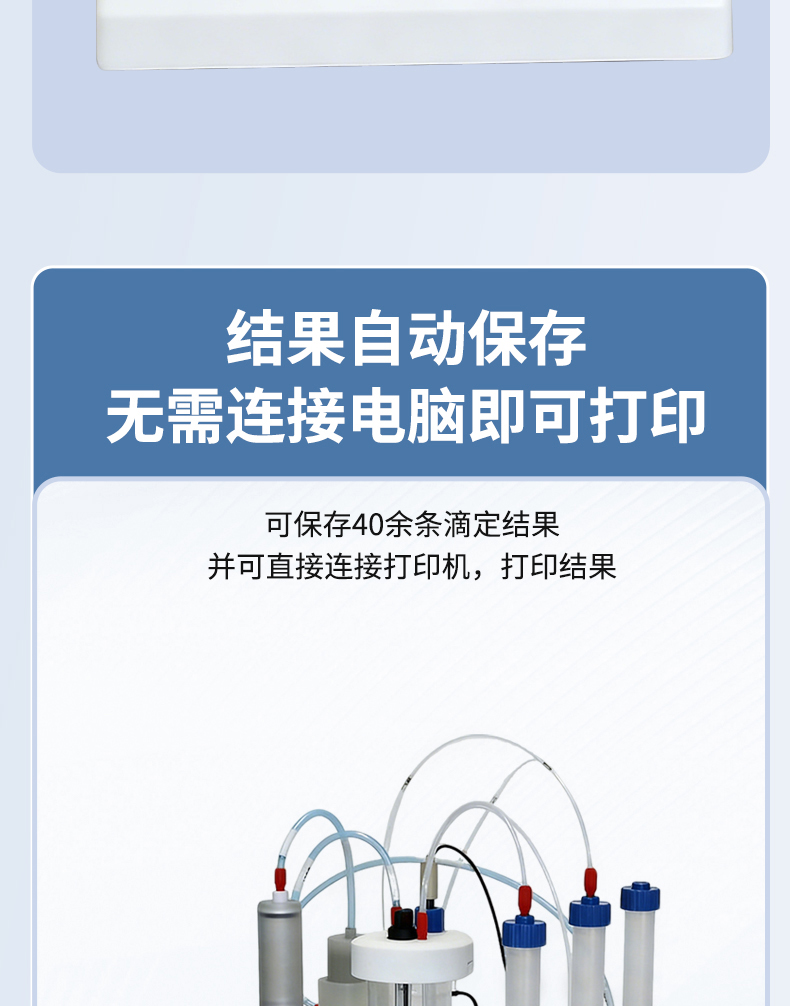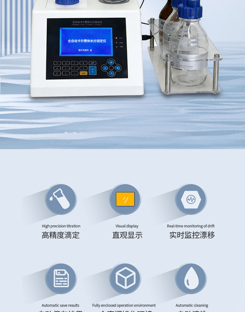 特色功能:*自定义终点延迟、滴定延迟;一键清洗;电流实时显示;仪器检定;废液瓶防溢出,标定记录保留6位小数,自动计算平均值、标准偏差、相对标准偏差,并支持打印。