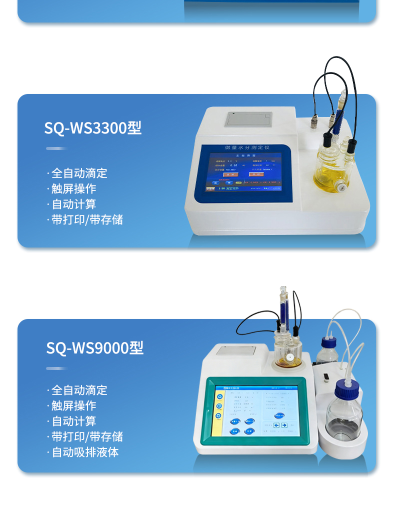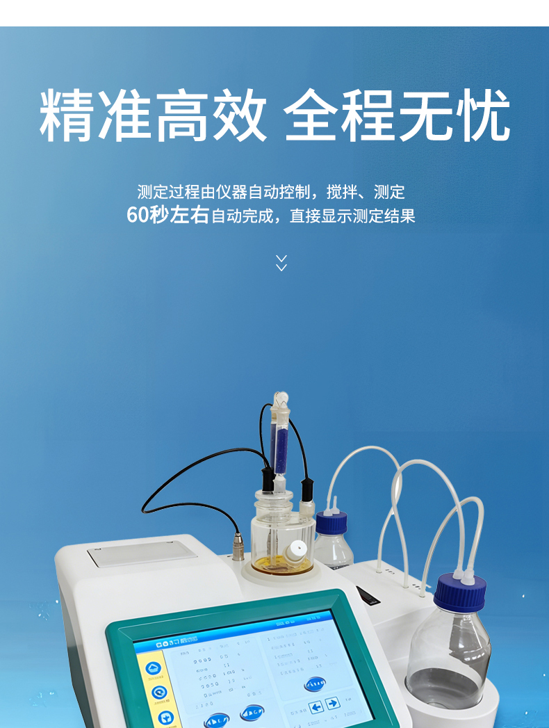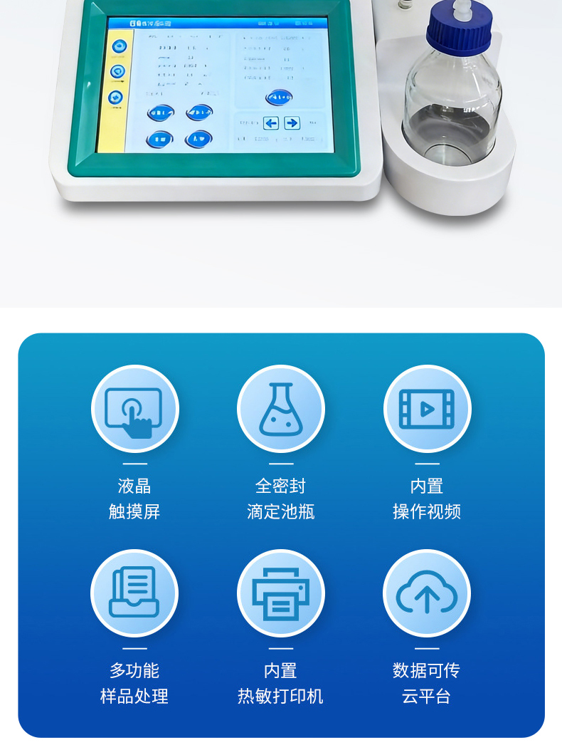 Ø 2、仪器具有试验结果存储、打印、计算功能;样品测定过程由仪器自动控制,搅拌、测定60秒左右自动完成,直接显示测定结果;全密封滴定池瓶,避免试剂与人接触,也避免环境湿度的影响;并具有自动计算平均值和历史记录打印功能,能打印出百分含量、样品编号、试验员、实验日期等内容;仪器准确度为:①水含量小于10微克水时,测量值误差小于2ug水;②水含量在10微克-1000微克水时,测量误差≤2ug水;③水含量在1000微克以上时,测量值误差≤0.2%(不含进样误差)。