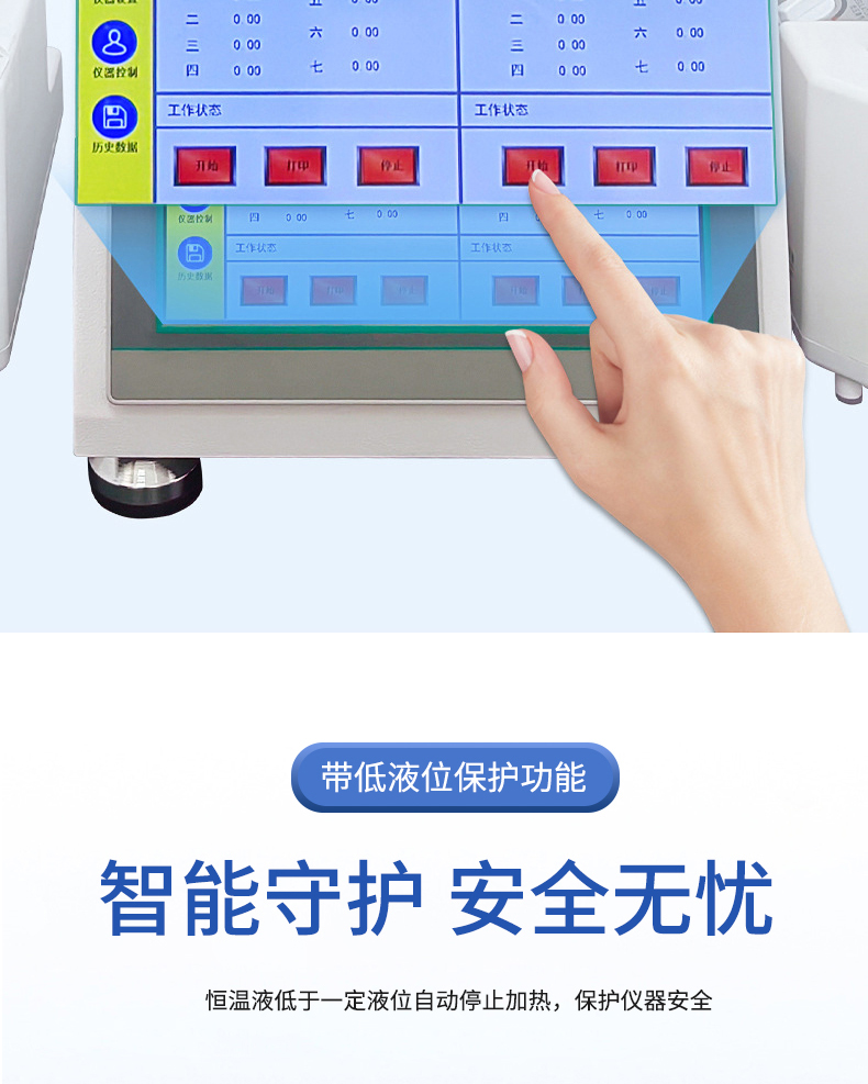 9、带低液位保护功能,恒温液低于一定液位自动停止加热,保护仪器安全。