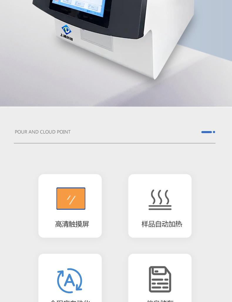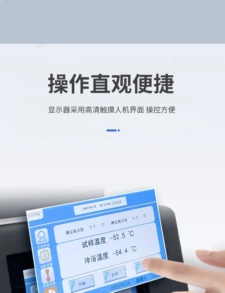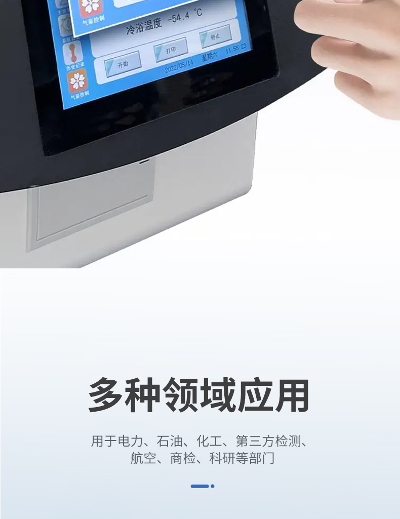 本仪器主要用于变压器油、润滑油、柴油及轻质油等石油产品凝点和倾点的测定。它严格遵循ISO 3016, ASTM D97和ASTM D6749,,采用空气加压法测试样品的倾点和凝点,只需4.5mL样品,测定过程由仪器自动完成,无需人工干预,测定速度快结果准确。样品的测试间隔为 1℃,测试结果具有更好的重复性和再现性。高精度的凝点和倾点测定“气压法”可有效避免降温过程中,样品的蜡状析出和冰晶体对结果的干扰。