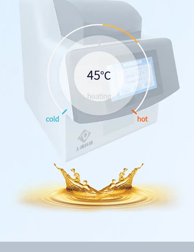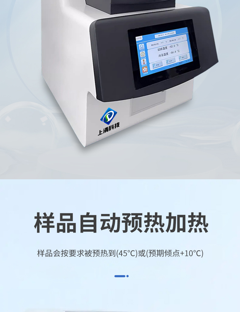 样品自动加热:按试验方法对样品预热步骤的要求,仪器也包括了样品预热的功能。每次测试时,样品会按要求被预热到(45℃)或(预期倾点+10℃).